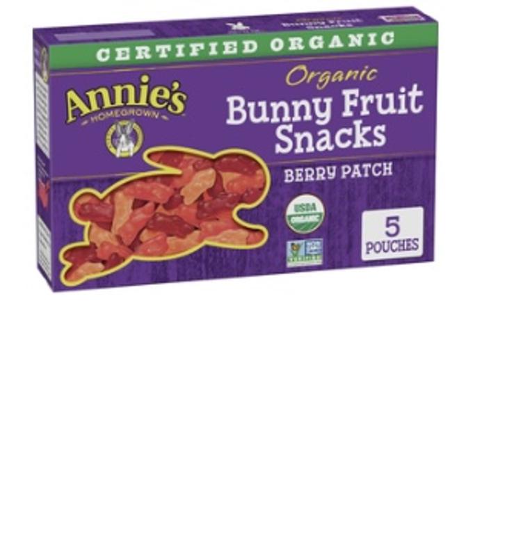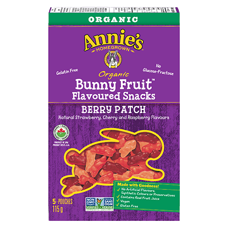 Annie's Homegrown Organic Berry Patch Bunny Fruit Snacks 5 ct. $4.68 ($0.94/ct) Icon details. Product description. Organic Berry Patch Bunny Fruit Snacks are a delicious mix of strawberry, cherry and raspberry flavored bunnies. Certified organic, these vegan and gluten-free bunny-shaped fruit snacks are made with real fruit juice and packed with 100% Daily Value of Vitamin C. Preparation instructions.