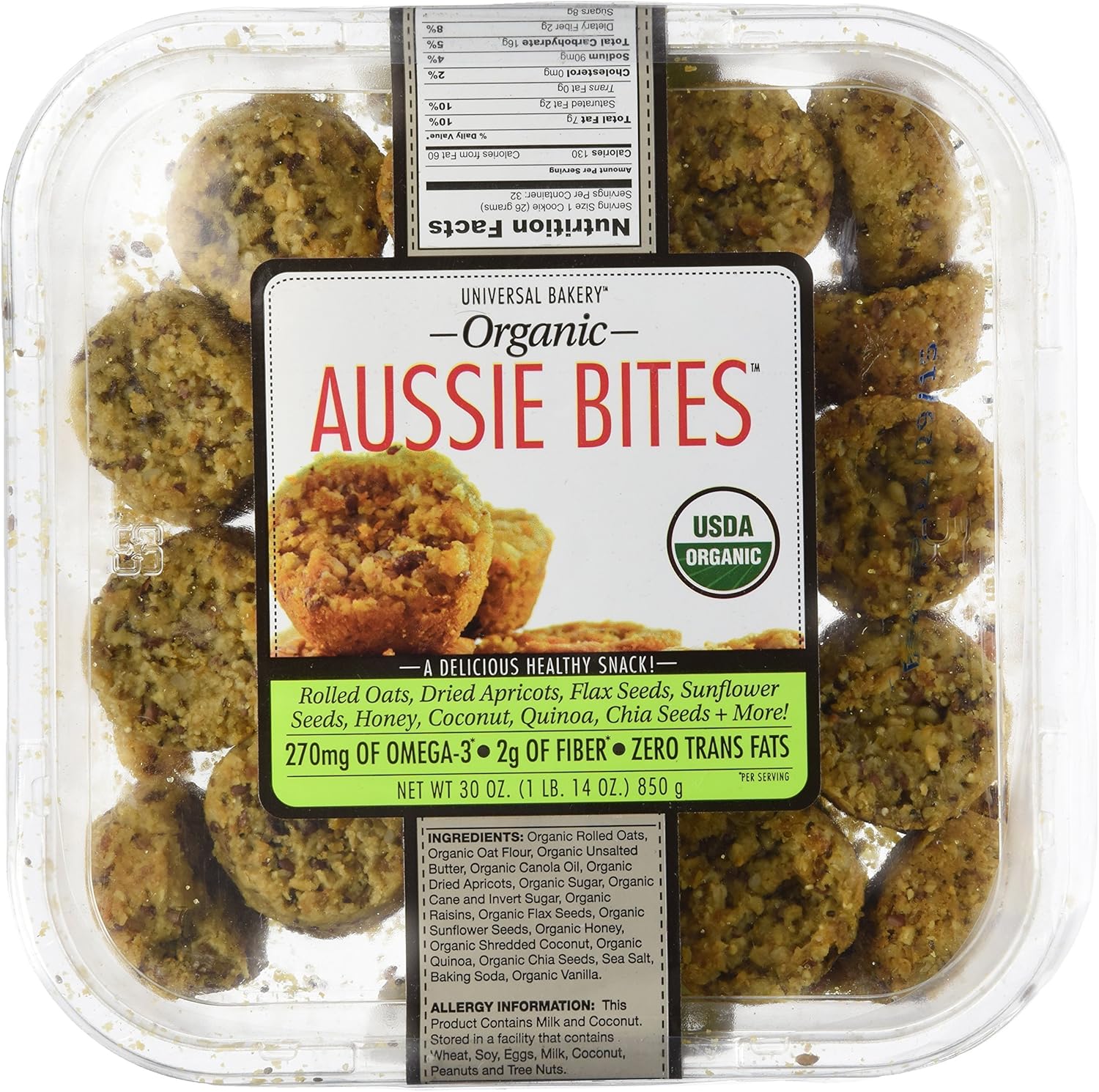 Aussie Bites at Costco (Amazing Little Snacks!) - Everyday Fun Finds The bites are similar to the size of a mini muffin. They are all organic and are made from rolled oats, dried apricots, flax seeds, sunflower seed, honey, coconut, quinoa, chia seed and more. Nutrition The serving size is 1 piece and each Aussie Bite contains 130 calories. Here is the full nutrition information from the label on the package. Taste