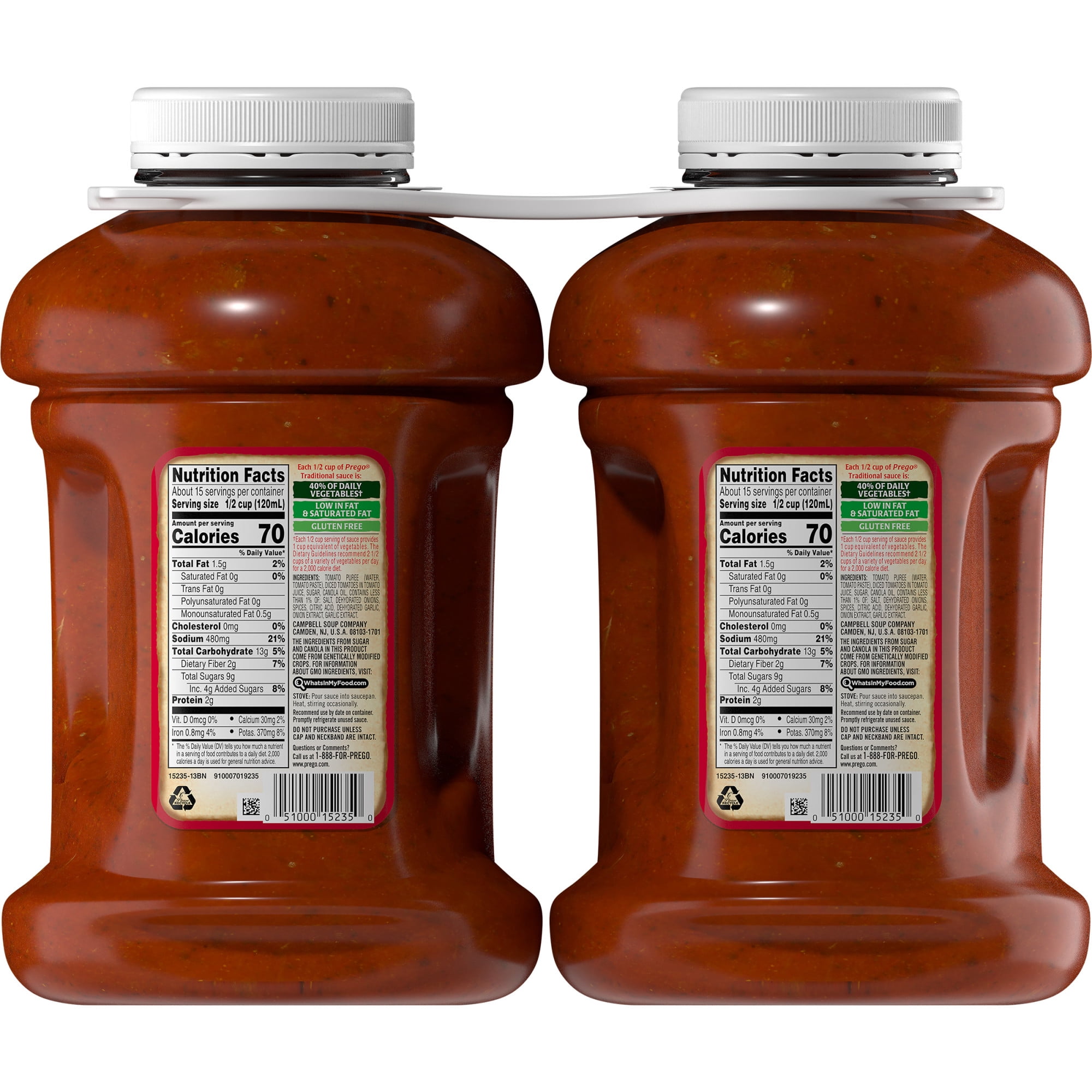 Prego - Traditional Spaghetti Sauce calories, carbs & nutrition facts ... Find calories, carbs, and nutritional contents for Prego - Traditional Spaghetti Sauce and over 2,000,000 other foods at MyFitnessPal. Log In. Sign Up. About Food Exercise Apps Community Blog Premium. Prego Prego - Traditional Spaghetti Sauce . Serving Size : 4.1 fluid ounce. 121 Cal. 62 % 18g Carbs. Prego Pasta Sauce, Traditional: Calories, Nutrition ... - Fooducate For women: 100 calories (25 grams, 6 tsp per day) For men: 150 calories (37 grams, 9 tsp per day) The FDA is more "generous", the Daily Value for added sugars is 200 calories (50 grams, 12 tsp per day). Here at Fooducate, we suggest sticking to the stricter option (only 25 grams per day for women, 37 grams for men). More info.