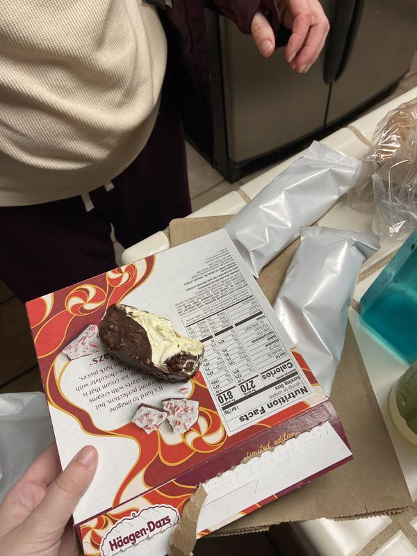 HAAGEN-DAZS Limited Edition Ice Cream Bars 3 ct Box - Walmart.com Our peppermint bark ice cream bars start with decadent white chocolate ice cream, dipped in thick, dark chocolate, then speckled with cool peppermint candy pieces. Creamy white chocolate ice cream, dipped in thick dark chocolate with peppermint candy pieces No rBST Kosher No artificial flavors or colors Packaging made from 100% recycled paperboard