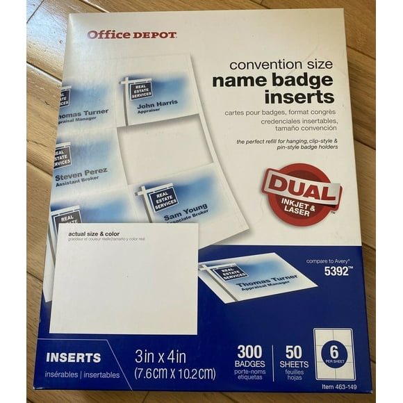 Avery 5392 Name Badge Insert Refills, White, 3" x 4", 6 ... DETAILS · 3" x 4" per badge · 6 inserts per sheet · Box of 50 sheets (300 inserts) · For use with Name Badge Holders, sold separately (Product codes: 05393, 74465, ...