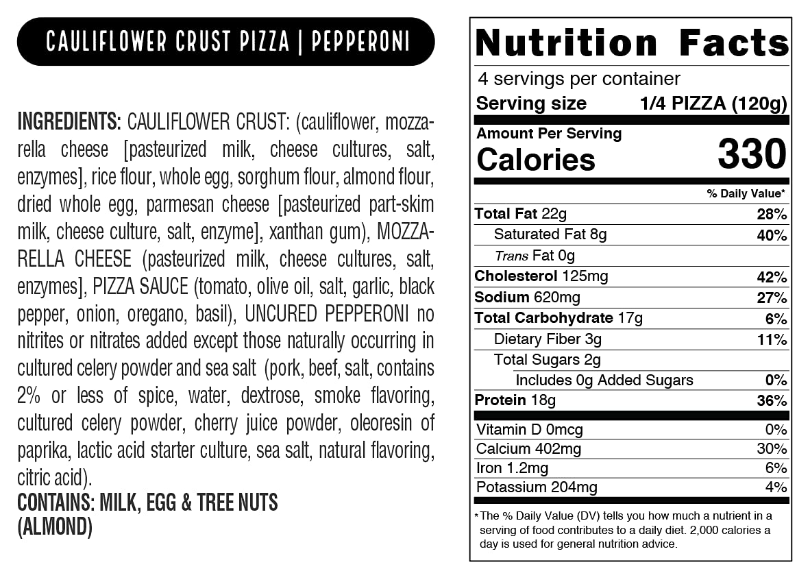 Real Good Pizza Co. Uncured Pepperoni Pizza Macro Nutrition Facts [Food ... Keto & Health Insights for Real Good Pizza Co. Uncured Pepperoni Pizza Net Carbs are 2% of calories per serving, at 6g per serving. This meal falls within the range for standard keto diet guidelines (at or under 25g of net carbs).