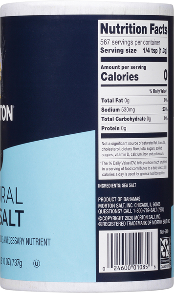 Fine Sea Salt Nutritional Facts - Morton Nutrition Facts. Serving Size 1/4 tsp (1.4g) Servings per container: about 357. * Percent Daily Values are based on a 2,000 calorie diet. Calories. Total Fat. Sodium. Total Carbohydrate. Protein. Amount per serving.