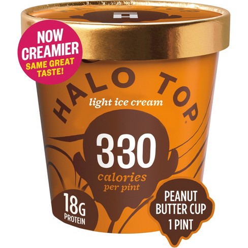 Halo Top Peanut Butter Cup Light Ice Cream, 16 fl oz Pint - Walmart One pint of Halo Top Peanut Butter Cup Light Ice Cream. While you prioritize your wellness, love yourself more with this rich, creamy light ice cream. Kosher, gluten free snack made with high-quality ingredients and ultrafiltered skim milk for better-for-you sweet treats. At 330 calories per pint, this sweet treat is lower in calories, lower in ...